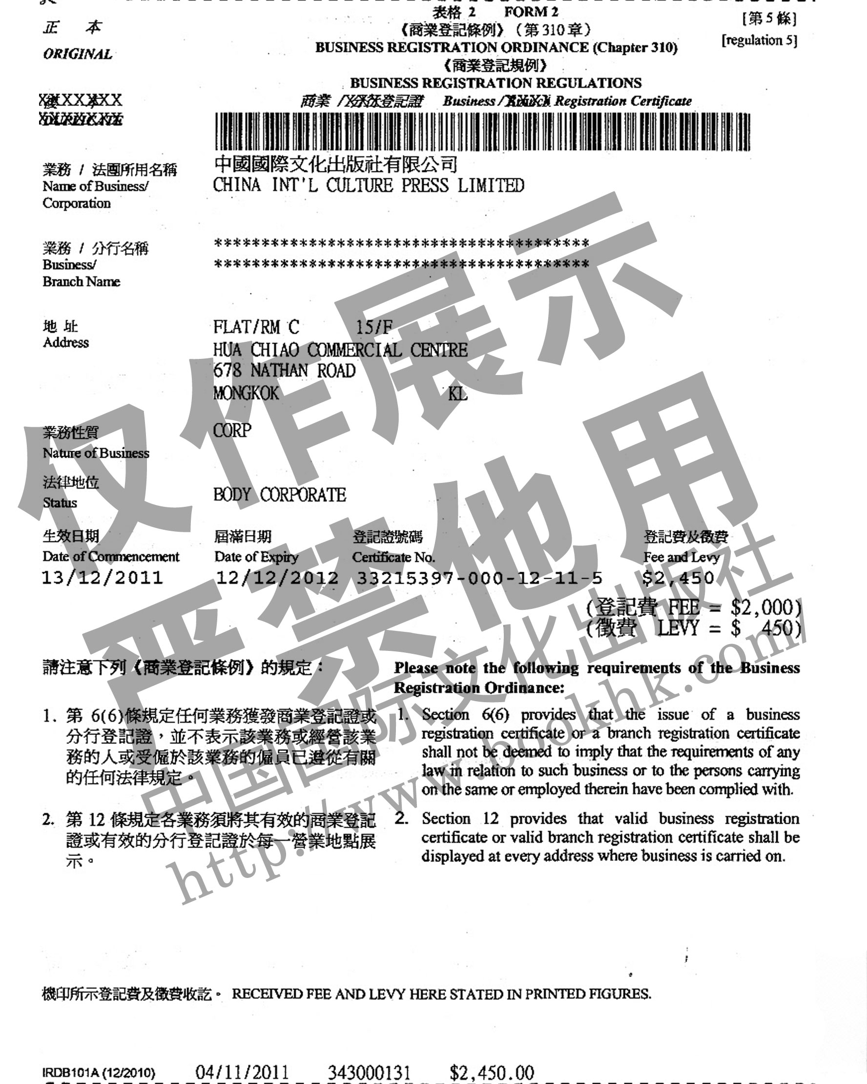 商业登记证(正面) 颁证机关:香港特别行政区政府商业登记署