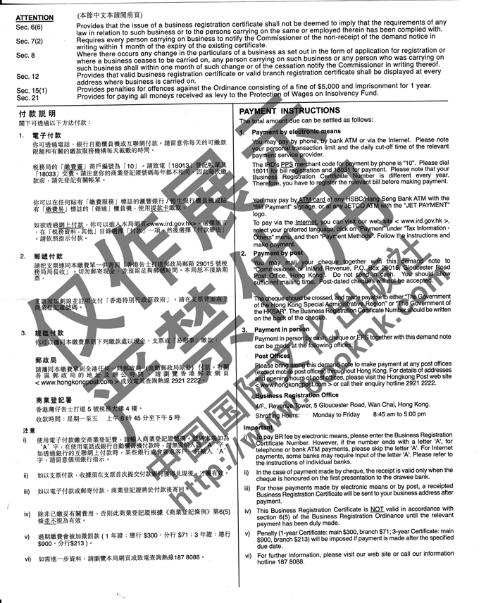 商业登记证(反面) 颁证机关:香港特别行政区政府商业登记署